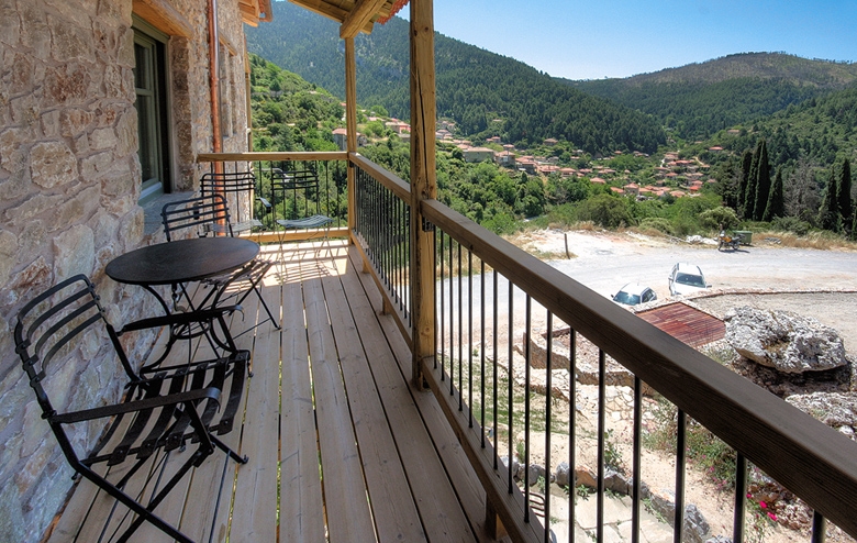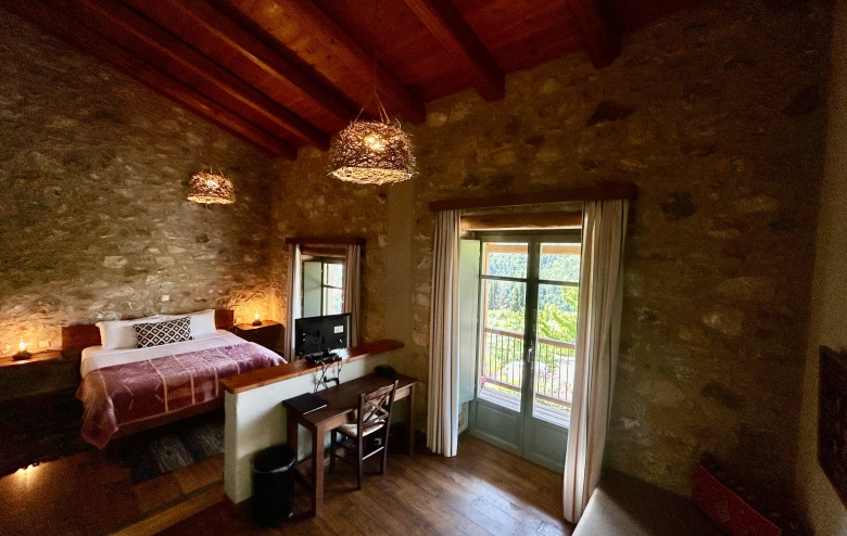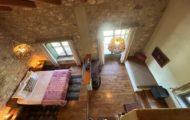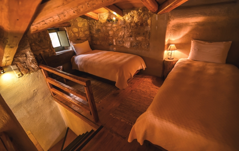 Ένα από τα μεγαλύτερα στον ξενώνα, με δυνατότητα φιλοξενίας πέντε ατόμων. Διαθέτει διπλό κρεβάτι υπερυψωμένο σε ξύλινο πάτωμα, δύο μονά κρεβάτια στη σοφίτα, και έναν χτιστό καναπέ-κρεβάτι δίπλα στο ενεργειακό τζάκι. Πάνω από αυτό δεσπόζει η σοφίτα με τον μικρό φεγγίτη που βλέπει στην αυλή, προσδίδοντας μια αίσθηση παραμυθένια. Κι αν αγαπάτε τα μαγικά ηλιοβασιλέματα στις κορυφές του Ταϋγέτου, δεν έχετε παρά να βγείτε στο μεγάλο δυτικό ξύλινο μπαλκόνι με το χαγιάτι. |