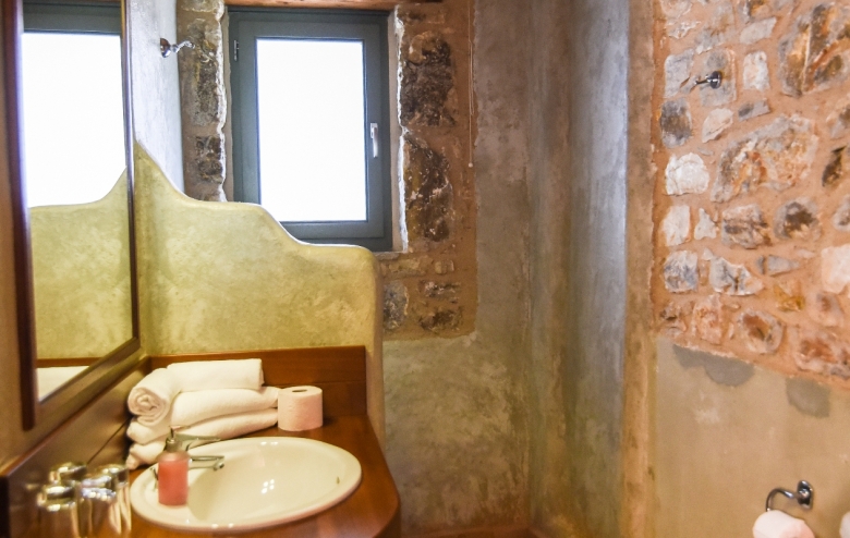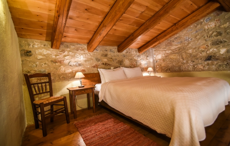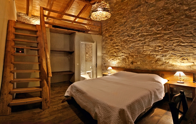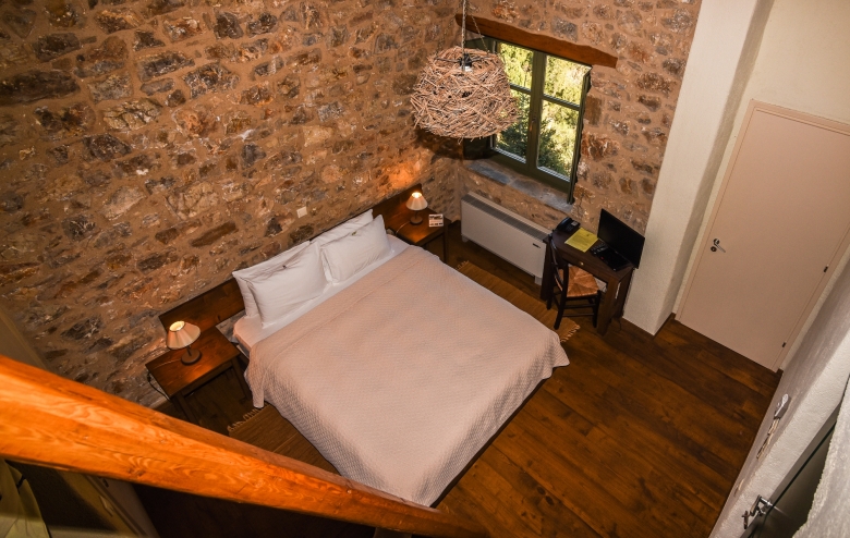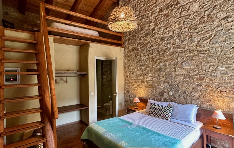 Κυρίαρχο διακοσμητικό στοιχείο του ξεχωριστού αυτού χώρου, η πέτρα. Το δωμάτιο είναι δίκλινο με διπλό κρεβάτι, υπάρχει ωστόσο ευελιξία μετατροπής του και σε τρίκλινο ή τετράκλινο. Το μπάνιο διαθέτει επίσης ιδιαίτερη αρχιτεκτονική. Ανεβαίνοντας τη σκάλα με τη μεγάλη κλίση θα οδηγηθείτε στην ευρύχωρη σοφίτα του δωματίου, ενώ μέσα από το μεγάλο παράθυρο θα απολαύσετε τη θέα στον βράχο του Άι-Γιάννη. |