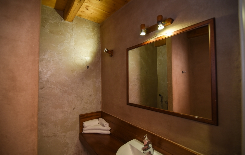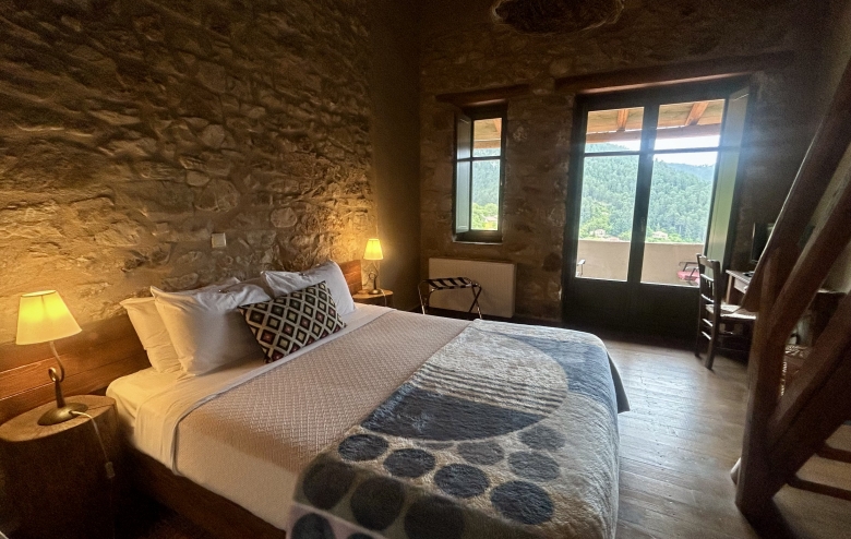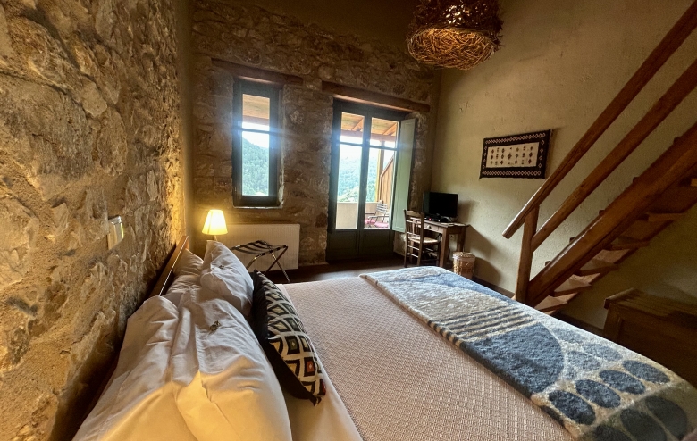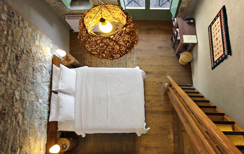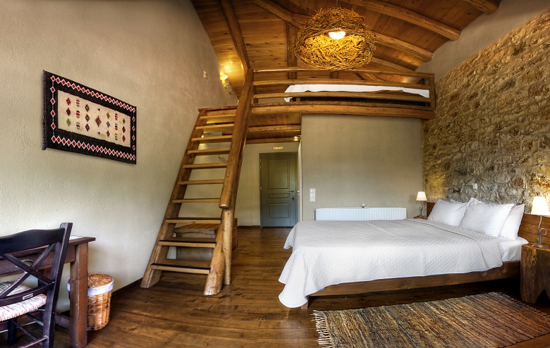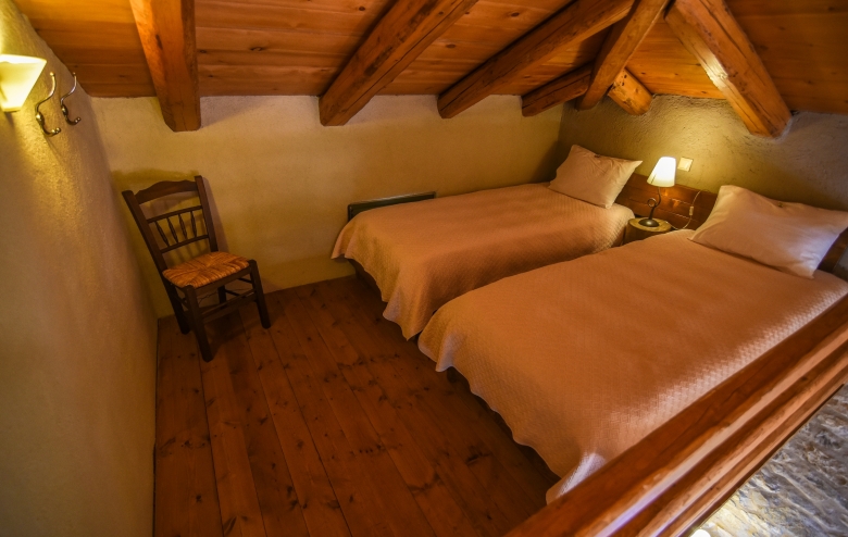Στο υψηλότερο σημείο του ξενώνα βρίσκεται το Εργαστήριο Α', ένα δίκλινο δωμάτιο με σοφίτα (που εύκολα γίνεται και τρίκλινο ή τετράκλινο). Διαθέτει ένα διπλό κρεβάτι και δύο μονά, αποτελώντας έτσι την ιδανική επιλογή για τετραμελή οικογένεια ή ζευγάρι. Μεγάλο προτέρημά του αποτελεί και το μπαλκόνι, με την επιβλητικότερη θέα από όλα τα μπαλκόνια του ξενώνα. |